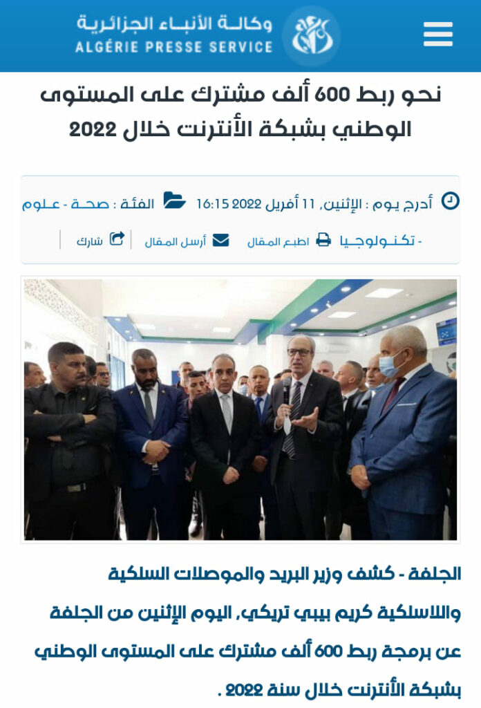 تطور كبير هاد العام في الربط بالالياف البصرية واصلة ل 58 ولاية بكابل طوله 200.000 كلم خاصة مع الوتيرة الكبيرة فالربط بالالياف البصرية لي بداوها هاد العام وين وصلو في اخر الاحصائيات لي داروها في الثلاثي الاول مارس وصلو 216.900 مشترك فيبر ( تحسن ب 117% وين ربطو 100.000 مشترك جديد في ثلاث اشهر هاد…